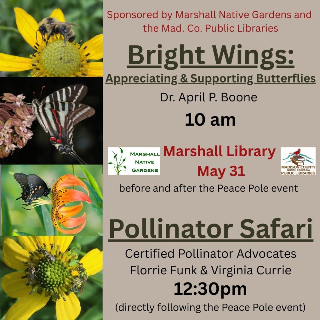 The Marshall Native Gardens Initiative (MNGI), The Rotary Club of Madison County, and the Marshall Library are hosting two presentations and a Peace Pole Celebration event on Saturday, May 31st. We invite you to come to all these fun free events!