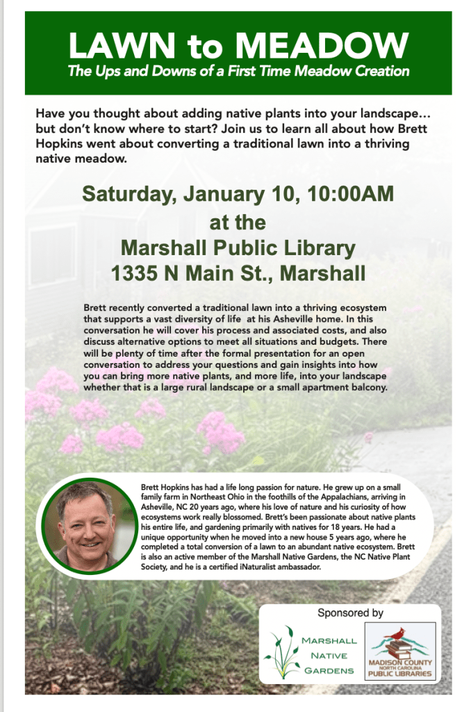 On Saturday, January 10th at 10am in the Library Meeting Room we will sponsor a presentation by Brett Hopkins that will tell you about the ups and downs of meadow creation. Brett is engaging, very knowledgable, and not to be missed!