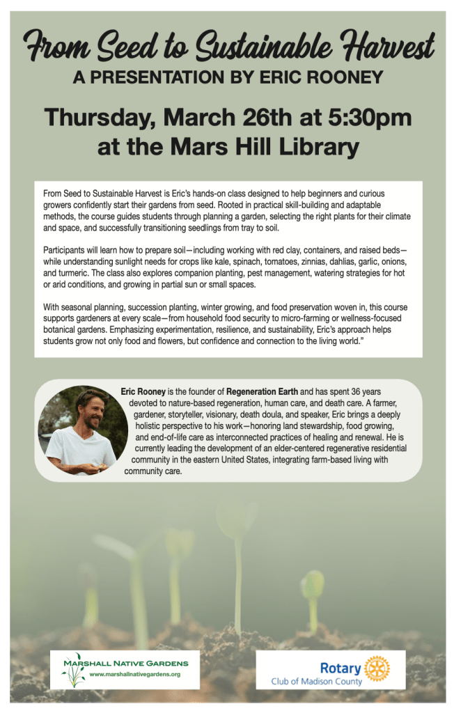 - Thursday, March 26th at 5:30pm in the Meeting Room of the Mars Hill Library (NOTE: DUE TO ROOM CONFLICTS, IT WILL NOT BE AT THE MARSHALL LIBRARY) we are hosting a free presentation by Eric Rooney, Founder of Regeneration Earth and a recognized land steward, gardener, and end-of-life care specialist. Eric will tell us about “Creating an Edible Garden from Seed”. This will be a co-sponsored event with the Rotary Club of Madison County. See the poster above for details…
