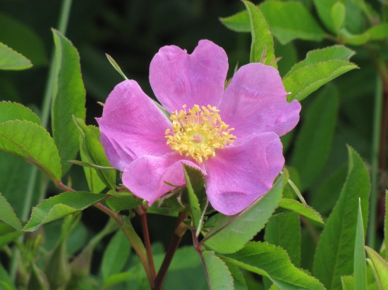 Grows from 1-3′ tall and often spreads by suckers to form colonies or thickets in the wild. Features single 5-petaled, pink flowers in May. No repeat bloom. Smooth, dark green foliage. Red hips in late summer.