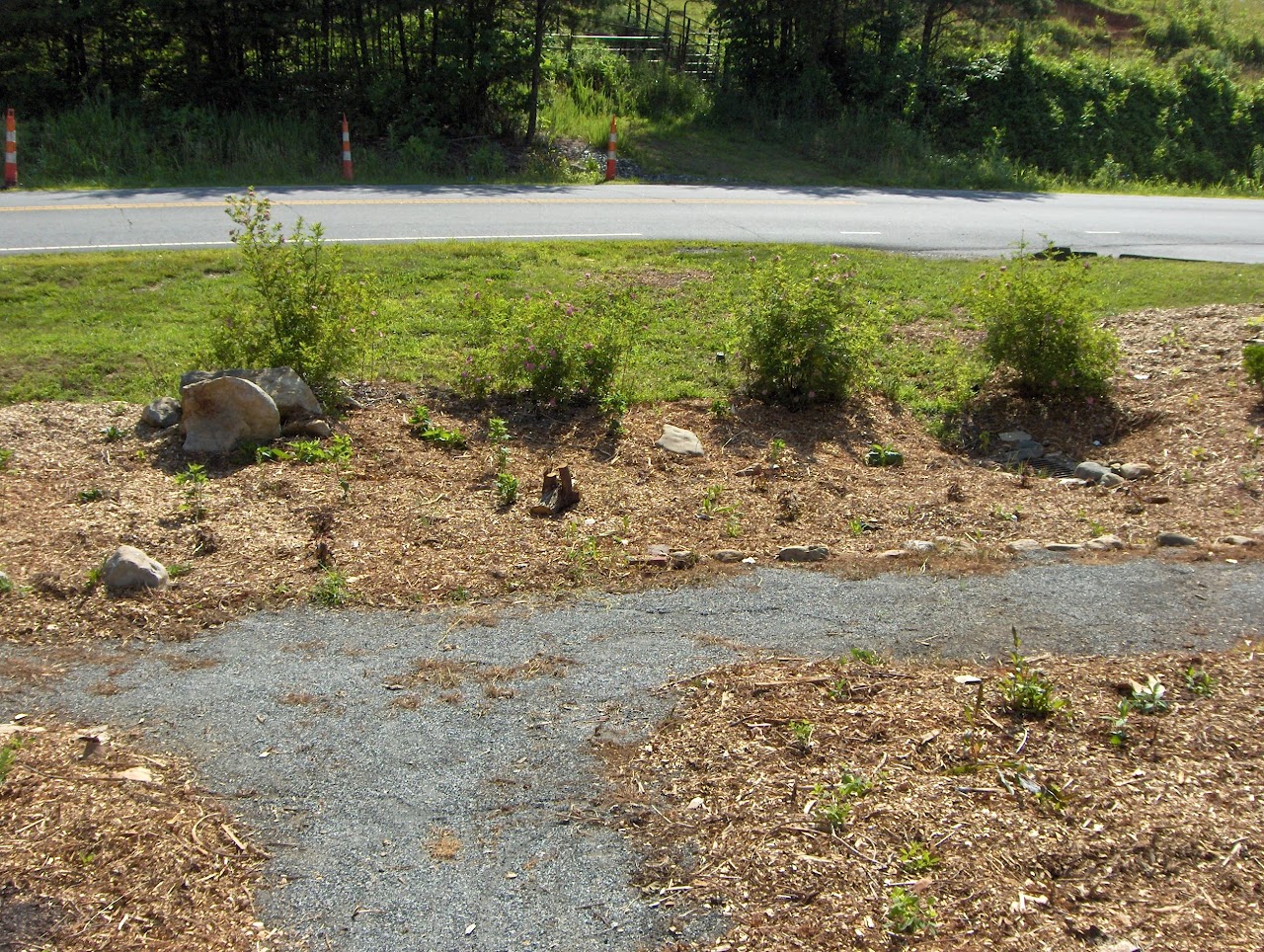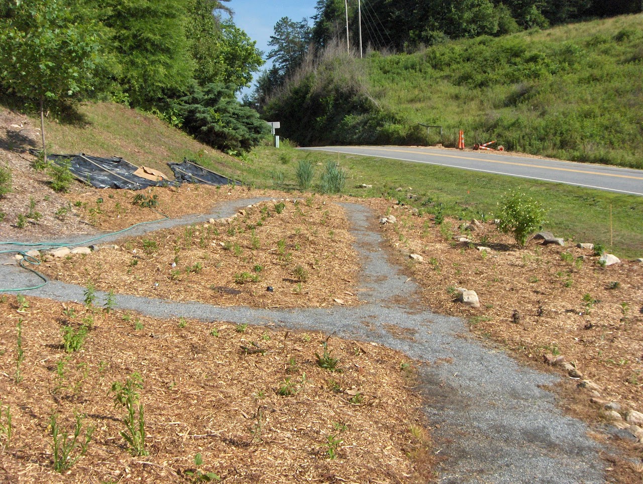 This garden was created in 2013-2015. First, woody host plants were planted in 2013. Then, in October 2014, dark plastic was placed in the garden to help kill weed seeds already established in the area. Pathways were established with landscape fabric and covered with gravel and fines (the silt from ground stone).
